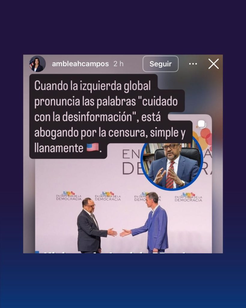 En una de sus historias, Campos expresó: “Cuando la izquierda global pronuncia las palabras ‘cuidado con la desinformación’, está abogando por la censura, simple y llanamente”.